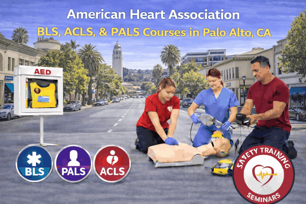 Safety Training Seminars offers the American Heart Association® (AHA) BLS Certification Course in Palo Alto, California, providing professional life-support training for healthcare providers and medical students throughout Santa Clara County and the surrounding Silicon Valley region. Palo Alto is home to some of the most recognized healthcare and research institutions in the country, including Stanford Health Care and Lucile Packard Children’s Hospital Stanford, making high-quality Basic Life Support training essential for medical professionals working in the area.